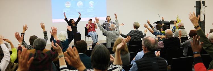 Neun Gemeinschaften stellten sich vor. Was die gut 60 Teilnehmerinnen und Teilnehmer begeisterte, war das konkrete Leben mit und für Gott und die Nächsten, das sichtbar wurde. Die Vielfalt des Einsatzes für Geschwisterlichkeit, Dialog und Verständigung in Kirchen, Religionen und Zivilgesellschaft beeindruckte alle. Ob es das Miteinander von Menschen mit und ohne Behinderung in der Arche Ravensburg oder der interreligiöse Dialog zwischen Juden, Muslimen und Christen im Haus Abraham in Stuttgart ist, der vierstimmige Stuttgarter Chor „Gospel im Osten“ mit den gesungenen Gebeten oder der noch viel mehrstimmigere Chor der Gemeinschaften in der Arbeitsgemeinschaft christlicher Kirchen (ACK) in Baden-Württemberg, überall wird authentisch die je eigene Religiosität gelebt. Wie daraus trotz aller Unterschiede geschwisterliches Miteinander erwächst, berichtete Gerhard Proß als Mitverantwortlicher des ökumenischen Netzwerkes „Miteinander für Europa“ ebenso wie Weihbischof Thomas Maria Renz, der von den ökumenischen Bischofstreffen in brüderlichem Geist unter dem Dach der Fokolar-Bewegung erzählte.
